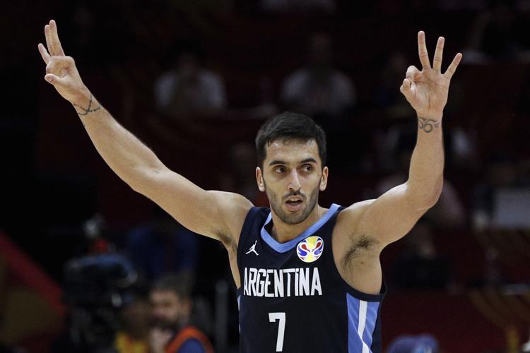 FILE - In this Sept. 4, 2019, file photo, Facundo Campazzo of Argentina celebrates after a teammate's 3-pointer against Russia during their Group B match in the FIBA Basketball World Cup at the Wuhan Sport Center in Wuhan in central China's Hubei province. Campazzo agreed to a two-year deal with the Denver Nuggets on Friday, Nov. 20, 2020, the opening day of free agency, according to a person with direct knowledge of the deal. The person spoke to The Associated Press on condition of anonymity because the contract remains unfinished until at least Sunday, when the NBA moratorium on new signings will be lifted. (AP Photo/Andy Wong, File)