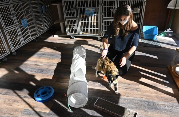 Colorado Gives Day is an annual event to encourage philanthropy in Colorado through online giving. There are more than 2,900 nonprofits to support on Colorado Gives Day, including many in Colorado Springs. One of the nonprofits is Safe Place for Pets, which supports terminally ill people with care for their pets. Executive Director Amalie Fellini plays with Daisy, an eight-year-old Calico kitty on Sunday, Dec. 6, 2020. Daisy’s owner died of Alzheimer’s disease. She was taken in by Safe Place for Pets and is up for adoption. Hospice nurses started the nonprofit nearly 25 years ago. (Photo by Jerilee Bennett, The Gazette)