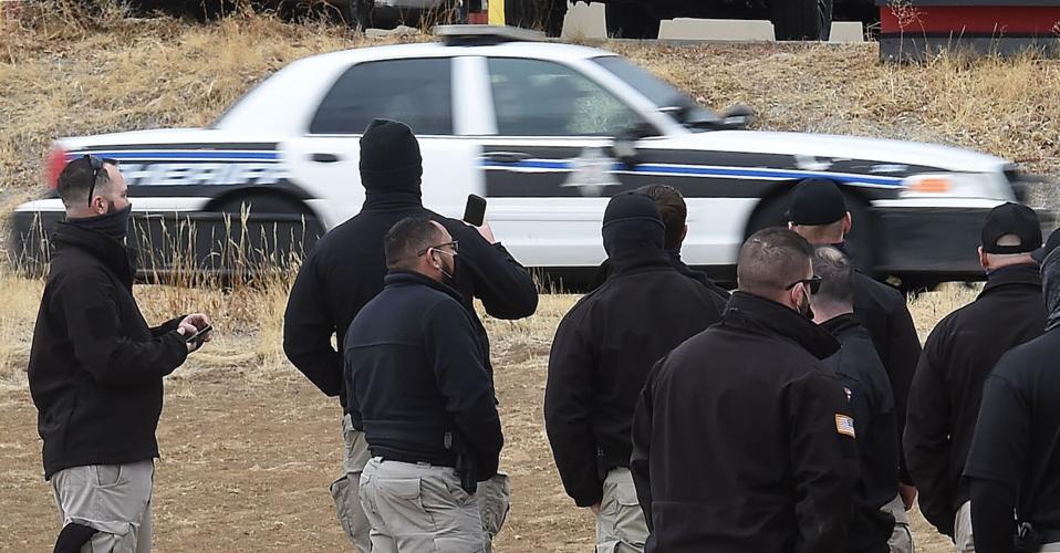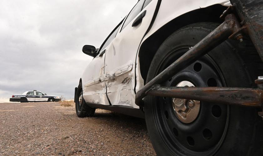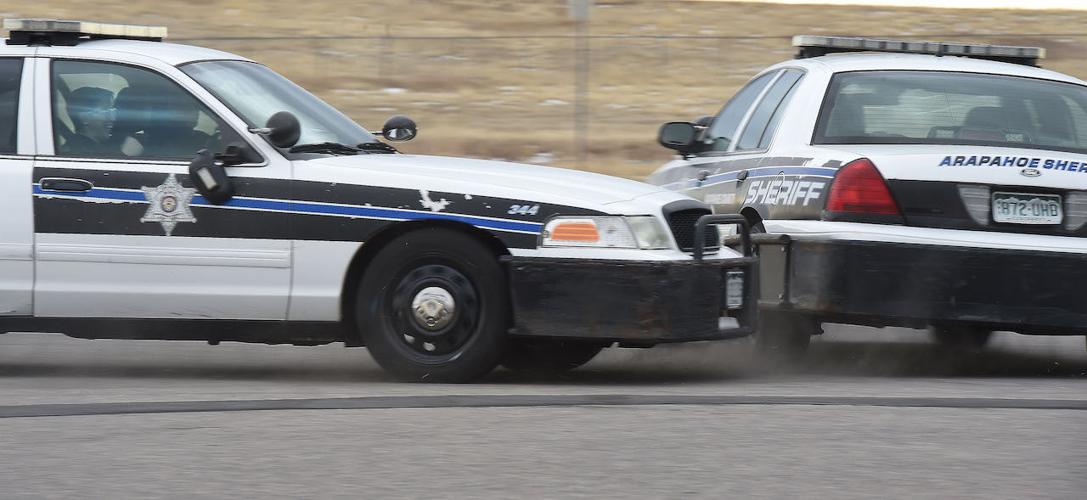 The Arapahoe County Sheriff’s Dept. was holding a driving school on Wednesday, Jan. 13, 2021, that looked more like a demolition derby. Older model cruisers are used to train officers to be able to stop a suspect when they are fleeing arrest. (Photo by Jerilee Bennett, The Gazette)