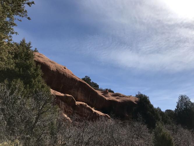 You’ll find surprises along the way, such as a sandstone ceiling. The juniper greenery occasionally breaks for sweeping views of blue sky and nostalgic fields at the foot of Pike National Forest’s rolling mountains.