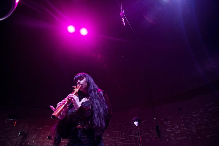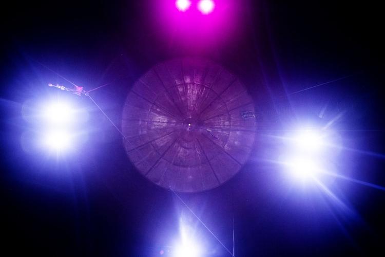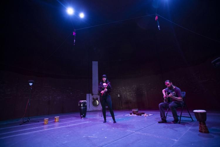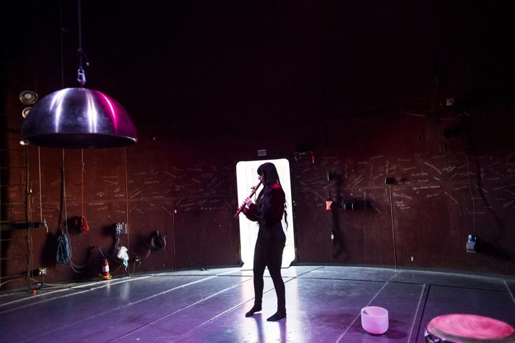 His guitar is familiar, but the notes are not. Each chord emits a transformed frequency that careens across the curving steel and up to the steel cap, where pink and blue fixtures softly stream through the darkness. Wade’s flute similarly reverberates. She adds to the pulsating cadence with a voice that has been called angelic.