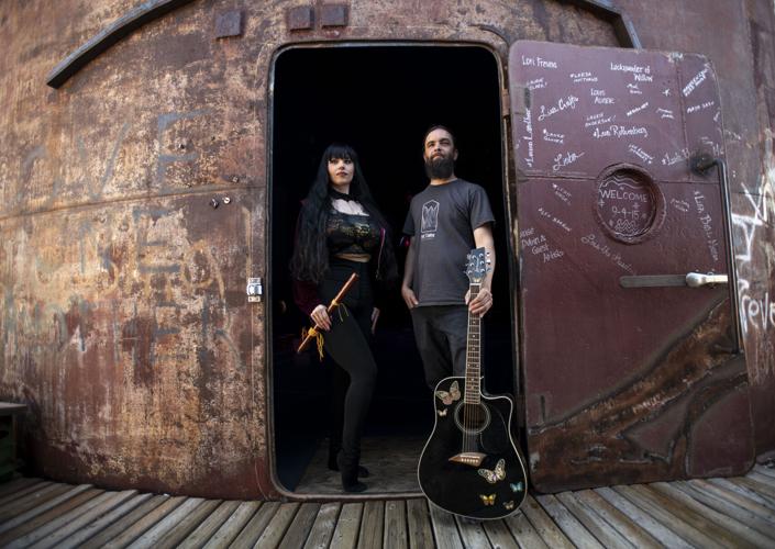 Here stands a rusty, 65-foot cylinder once built to store water, emblazoned with an old railroad logo and graffiti from over the years. Inside there is a young woman with long, jet-black hair in Victorian dress and a young man with plain garb and a scraggly beard.