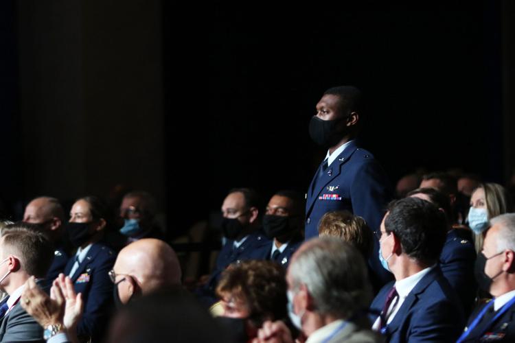 Second Lt. Aryemis Brown, a 2021 Air Force Academy graduate who commissioned directly into the Space Force with 117 other cadets, stood amongst a packed crowd as Raymond praised him.
