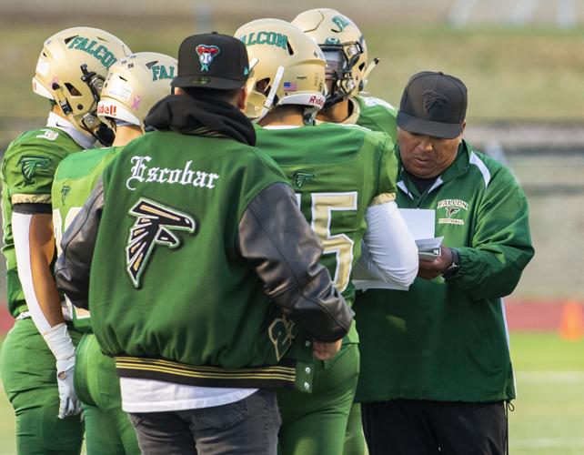 Interim head coach Josh Flores, right, stands with his Falcons team during the national anthem before their game against Liberty on Friday, Oct. 1, 2021, at Falcon High. The school football program was suspended to one week after an investigation into reports of serious misconduct involving a hazing incident.