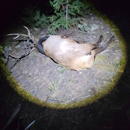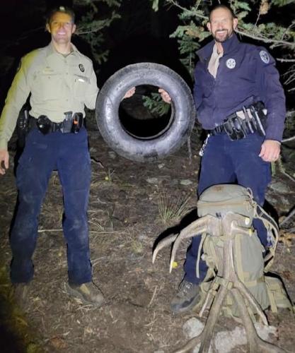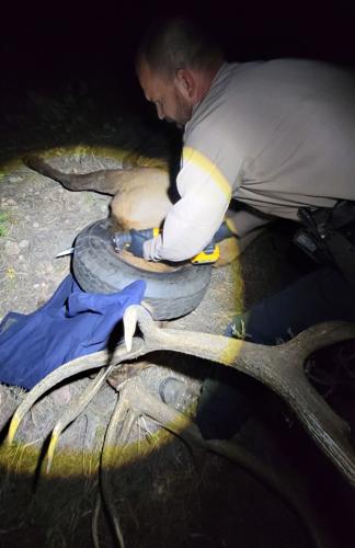 After the tire and antlers were removed, the elk was back on his feet within minutes, wildlife officer Dawson Swanson said in a release. About 35 pounds were removed from the elk, with the antlers, tire and 10 pounds of debris caught inside the tire.