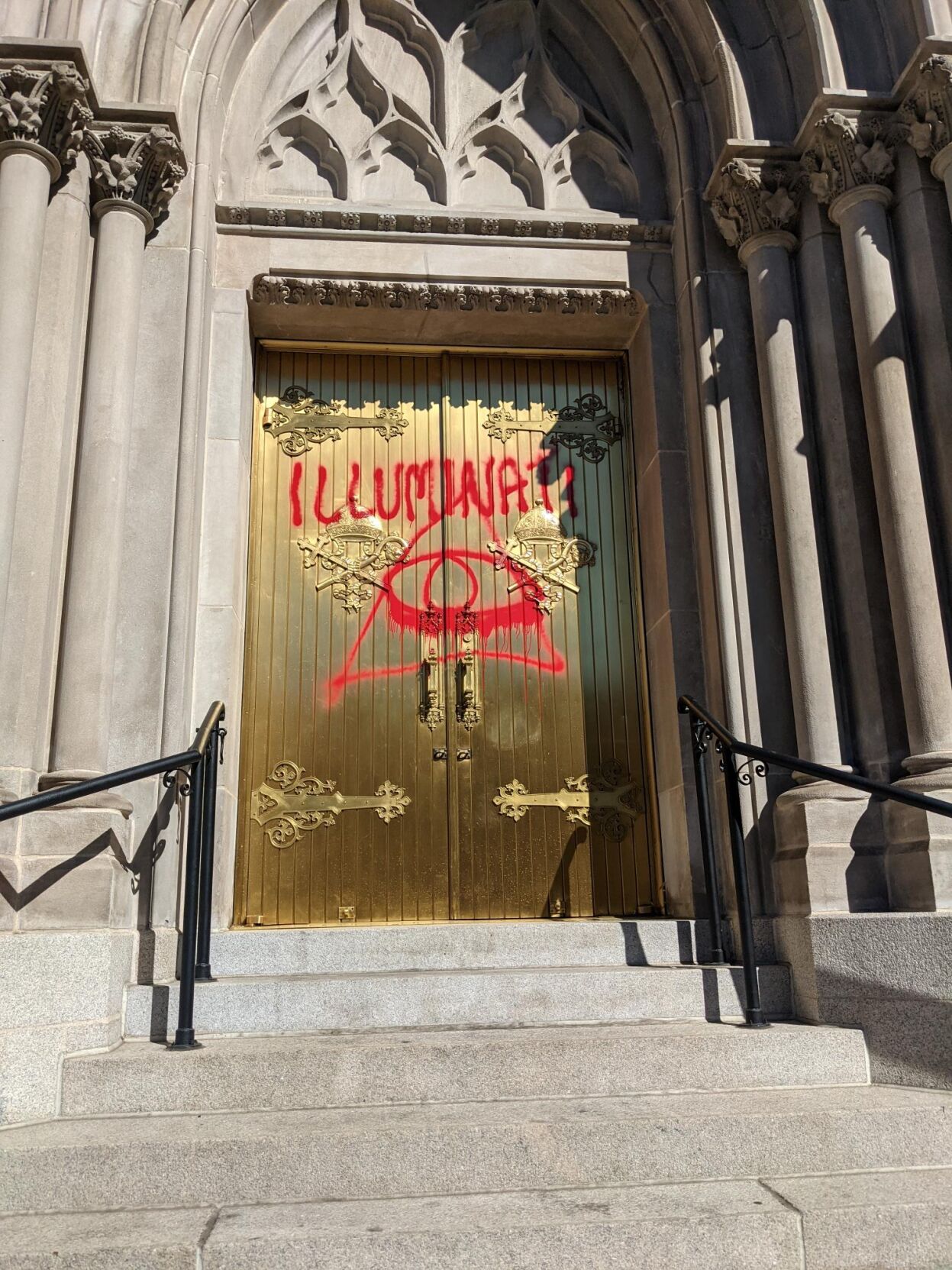 Parishioners were shocked by the message scrawled in red paint on the brass doors of the Cathedral Basilica of the Immaculate Conception Sunday morning.