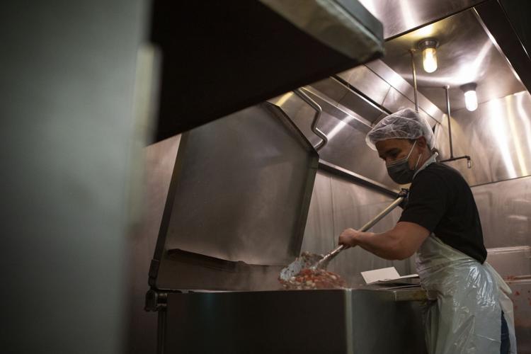 An employee passes along a ham and cheese empanada to be rolled by the next set of hands into its final shape on Wednesday, Feb. 16, 2022, at Maria Empanada in Denver, Colo. (Timothy Hurst/The Denver Gazette)