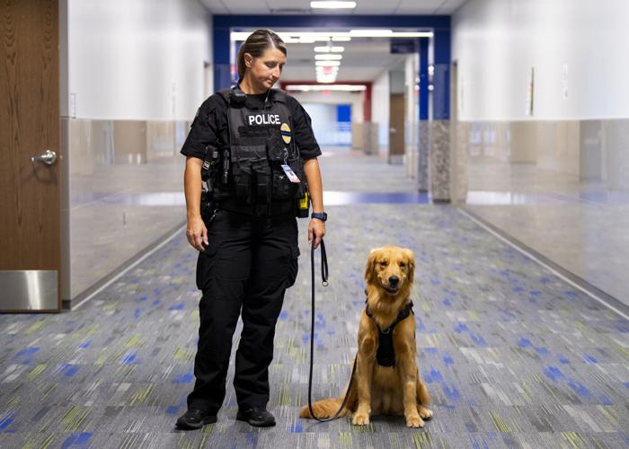 An 18-month-old golden retriever, Boomer recently took over for K-9 Amp, a German shepherd who served the district for six years before retiring in the spring. The four-legged officer is based at Fountain Middle School, but travels to several schools in the district.
