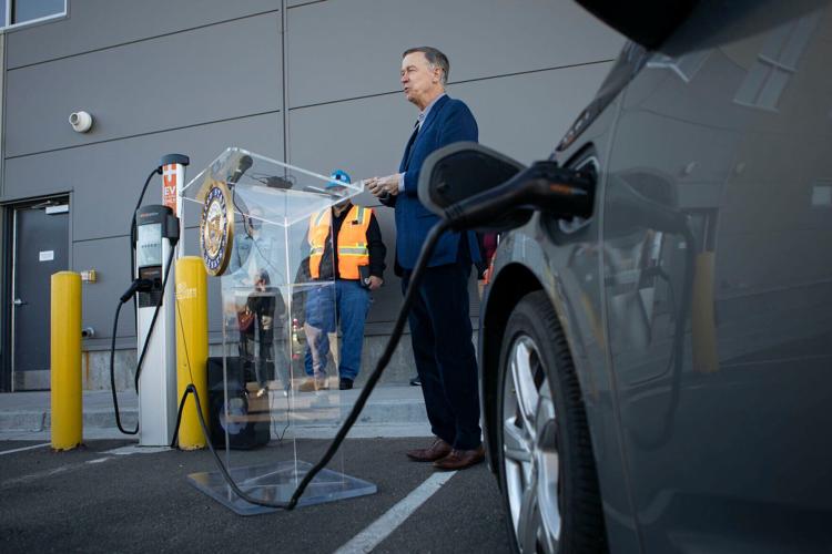 U.S. Sen. John Hickenlooper, D-Colo., speaks at a podium next to an electric vehicle charging station during a press conference on the $1.2 trillion infrastructure bill that he helped negotiate in the Senate, on Friday, Nov. 12, 2021, at the Edgewater Civic Center.