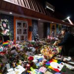 Mourners gather outside Club Q to visit a memorial, which has been moved from a sidewalk outside of police tape that was surrounding the club, Friday, in Colorado Springs. The memorial has been growing since a Nov. 19 fatal shooting at the bar killed five people and injured at least 22 others.