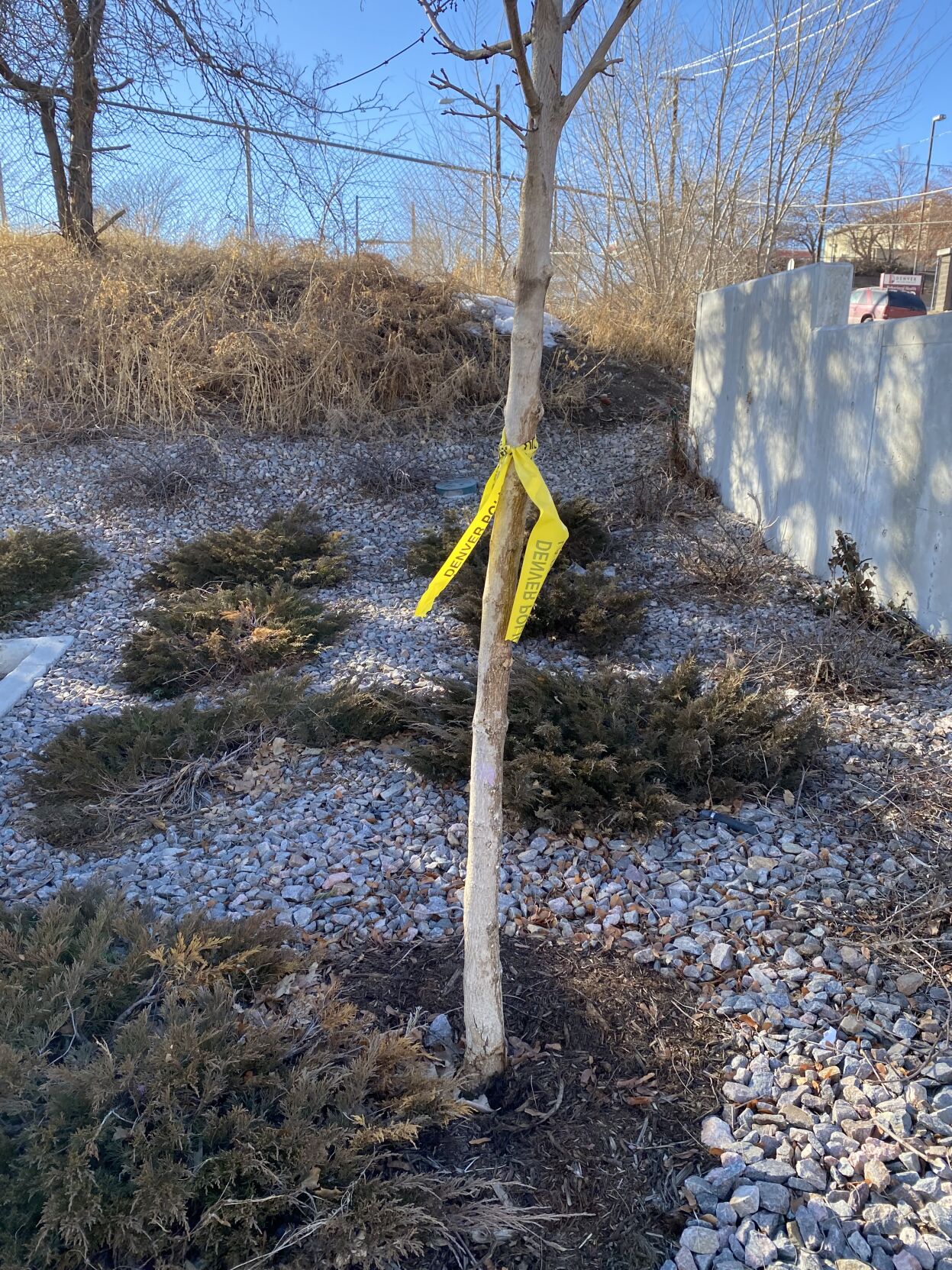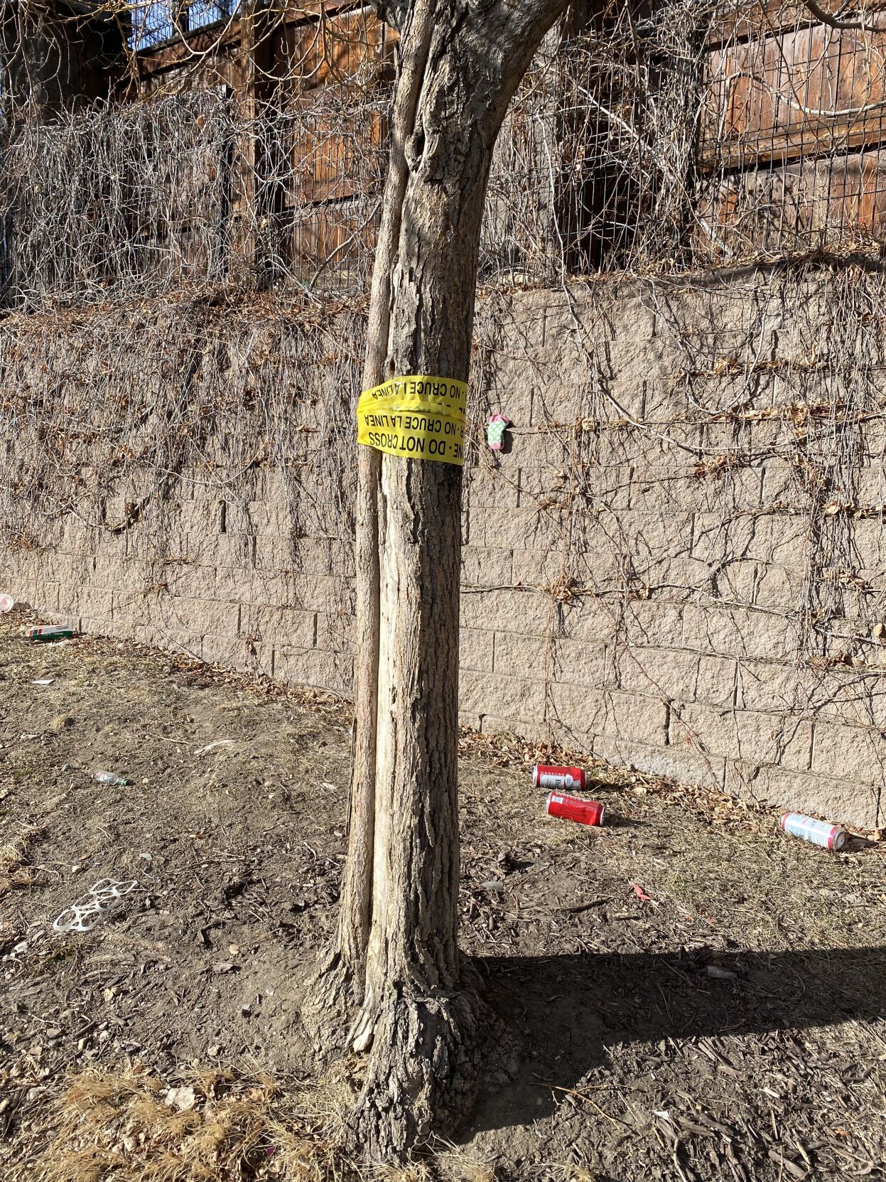 Denver Police Department crime scene tape still dangles from a tree where a 12-year-old Denver boy died bleeding from a gunshot wound in an allegedly stolen car.