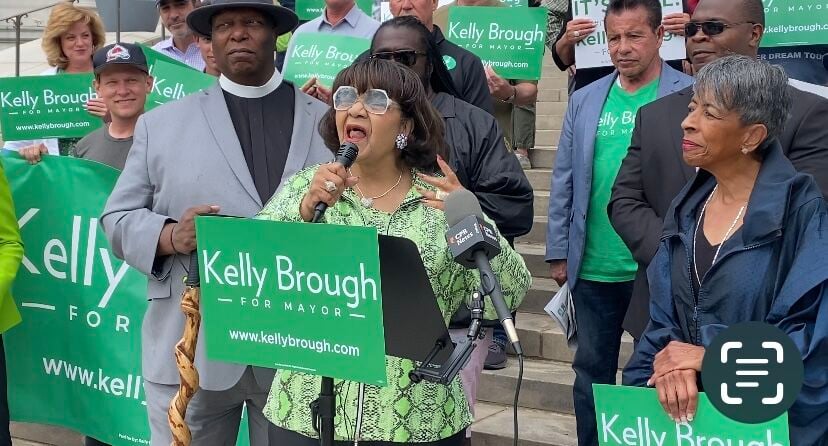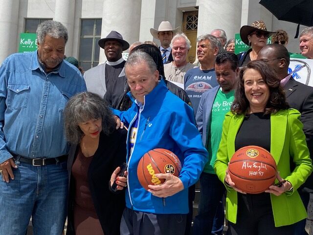 With less than a week to go before Denver’s mayoral election, Kelly Brough stood in front of the Denver City and County building with dozens of green-t-shirted supporters and held up a signed Alex English basketball in a nod to the Nuggets’ first NBA Finals.