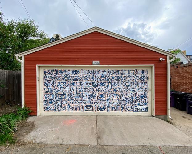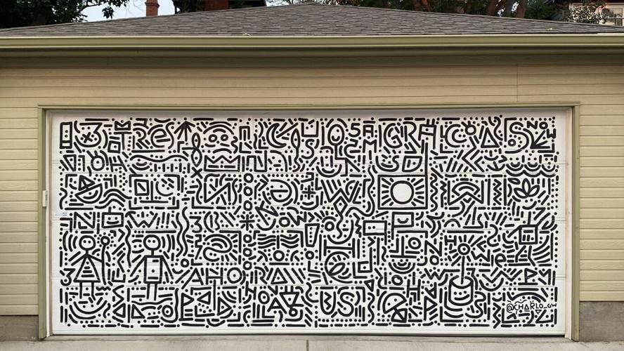 Following others on neighborhood garages, this mural would span the wall of a business parking lot. It would be Charlo’s biggest, most-seen work yet with similar elements: a waving, swirling, monochromatic spread of lines and dots and symbols and letters spelling hidden messages.