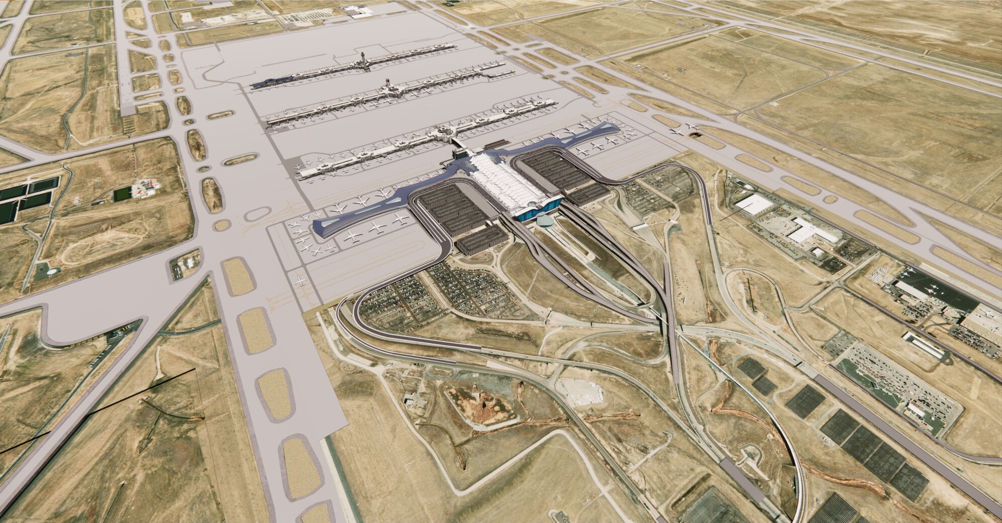 The plan involves four new concourses that will allow for 25 new gates per concourse — 100 new gates in total. The operation also involves a new processing area on the southside of the airport and a consolidated car rental area.