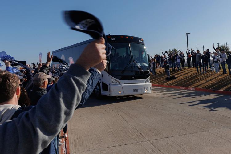 Once the buses come in, the group migrates to the opening gates of McKinney ISD Stadium to welcome them with signs, cheers and encouraging words before the game.