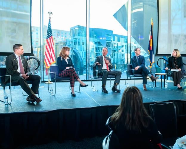 Colorado legislative leaders on a panel discussion for the Denver Metro Chamber of Commerce's Business Legislative Preview Tuesday at the Denver Art Museum. From left: House Minority Leader Mike Lynch, R-Wellington; House Speaker Julie McCluskie, D-Dillon; Senate Minority Leader Paul Lundeen, R-Monument; Senate President Steve Fenberg, D-Boulder; and moderator Bente Birkeland, CPR News.