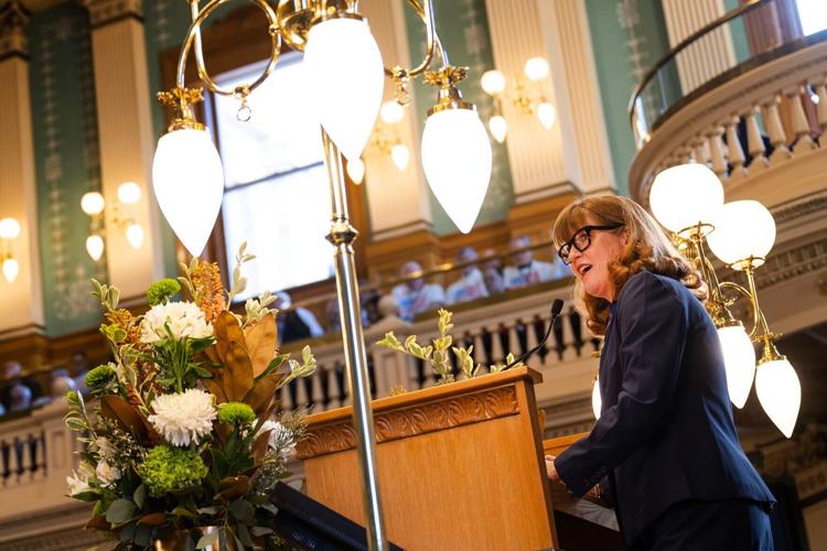 Speaker of the House Rep. Julie McCluskie looks at the large screen showing votes for a joint house resolution during the first day of Colorado's 2024 legislative session at the Colorado State Capitol building on Wednesday, Jan. 10, 2024, in Denver, Colo.(Timothy Hurst/Denver Gazette)