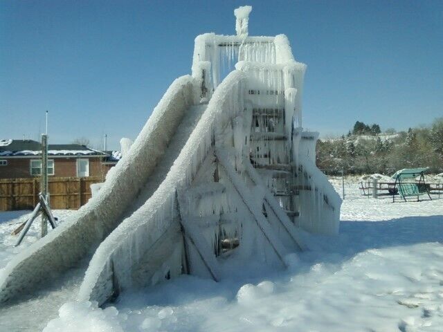 Christensen and the kids just kept adding to their ice creations, until it became a mission and not just a distraction. The next year, Christensen salvaged a bunch of lumber and built a rather large frame in his front yard, and created a lugelike ice slide from the top of it.