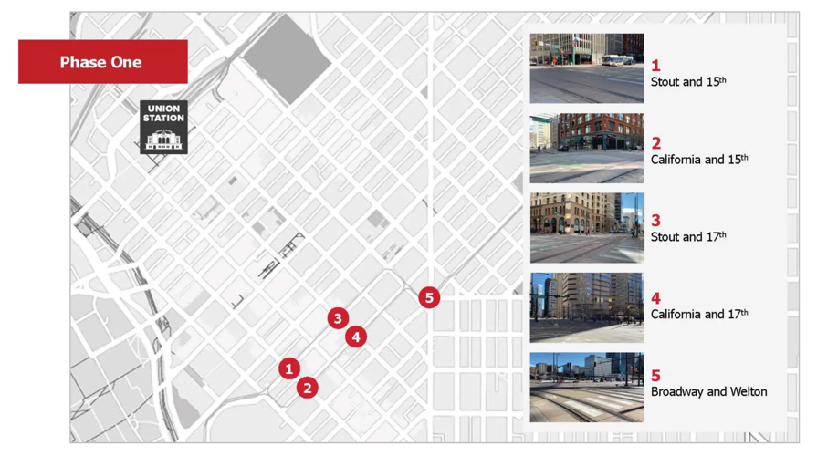 The five intersections that will be reconstructed in the project’s first phase are located at 15th and Stout streets, 17th and Stout, 15th and California, 17th and California and Broadway and Welton Street.
