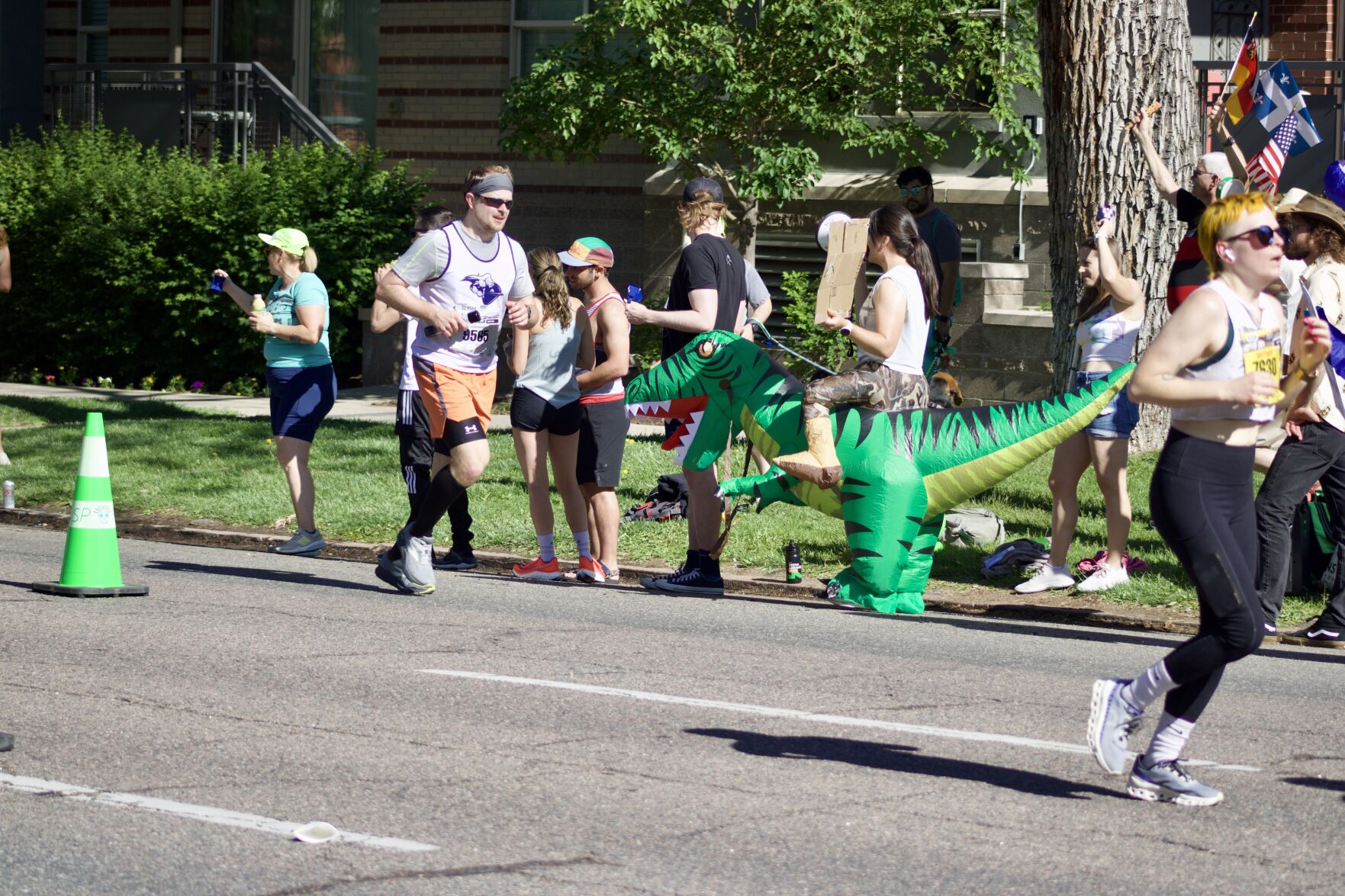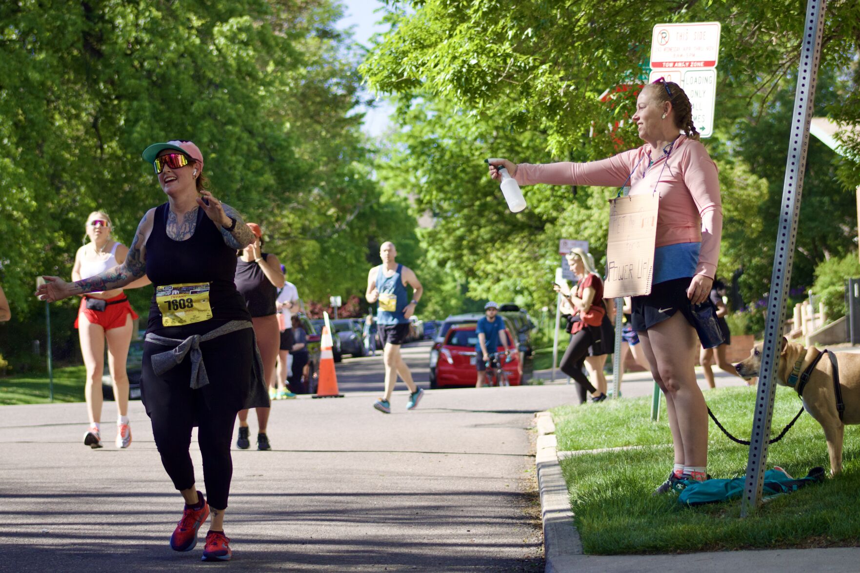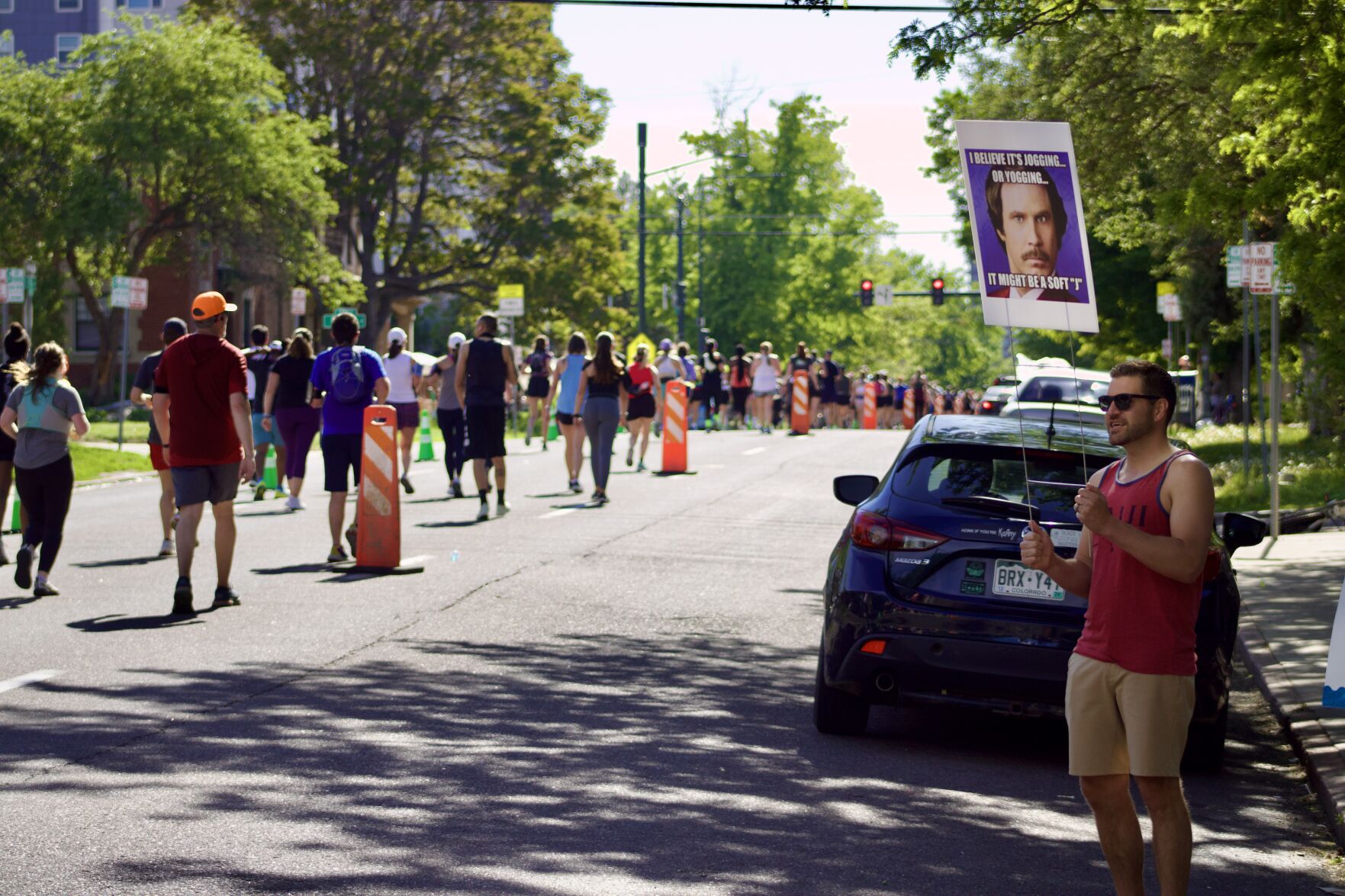 A marathon race spectator holding a sign with fictional anchorman Ron Burgundy reading "I believe it's jogging... or yogging... it might be a soft 'I'" during Denver's Colfax Marathon on Sunday, May 19 in Denver, Colo. (Noah Festenstein, Denver Gazette) A group of marathon race spectators holding signs to "power up," "hurry up" and "worst parade ever" while runners enter City Park during the last mile of Denver's Colfax Marathon on Sunday, May 19 in Denver, Colo. (Noah Festenstein, Denver Gazette) Half marathon runners on 17th Street enter the final stretch of Denver's Colfax Marathon on Sunday, May 19 in Denver, Colo. (Noah Festenstein, Denver Gazette) Marathon runners in all races sprint in the final 200 meters to the finish line during Denver's Colfax Marathon on Sunday, May 19 in Denver, Colo. (Noah Festenstein, Denver Gazette) Half marathon runners on 17th Street enter the final stretch of Denver's Colfax Marathon on Sunday, May 19 in Denver, Colo. (Noah Festenstein, Denver Gazette) Marathon runners pick up speed while approaching the final stretch at mile marker 24 on 17th Street during Denver's Colfax Marathon on Sunday, May 19 in Denver, Colo. (Noah Festenstein, Denver Gazette) A spectator's "spritz station" with a sign reading "pet the potato to power up" sprays marathon runners with water as they approach the finish line of Denver's Colfax Marathon on Sunday, May 19 in Denver, Colo. (Noah Festenstein, Denver Gazette) Spectator's and dinosaurs alike cheer on runners as they approach the finish line of Denver's Colfax Marathon on Sunday, May 19 in Denver, Colo. (Noah Festenstein, Denver Gazette)