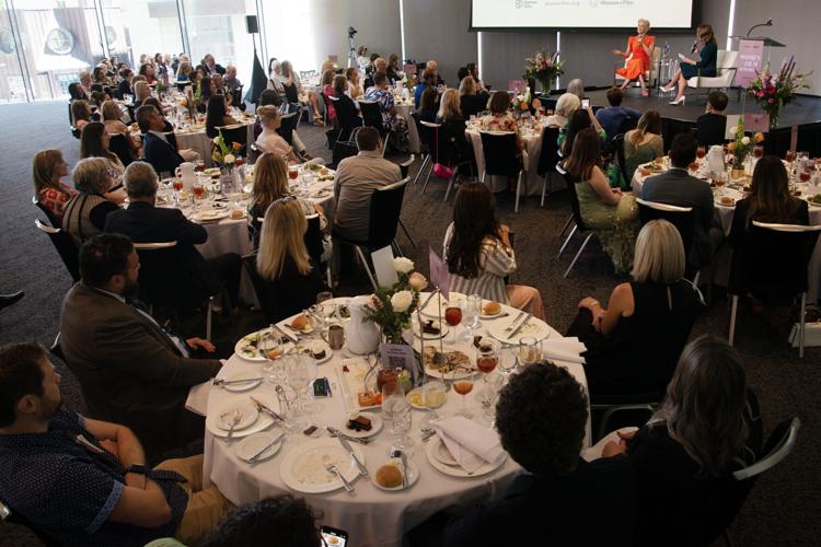 Kelly Werthmann, left, awards actor Hannah Waddingham the Barbara Bridges Inspiration Award at a Women+Film luncheon at the Denver Art Museum on Thursday, May 16, 2024.