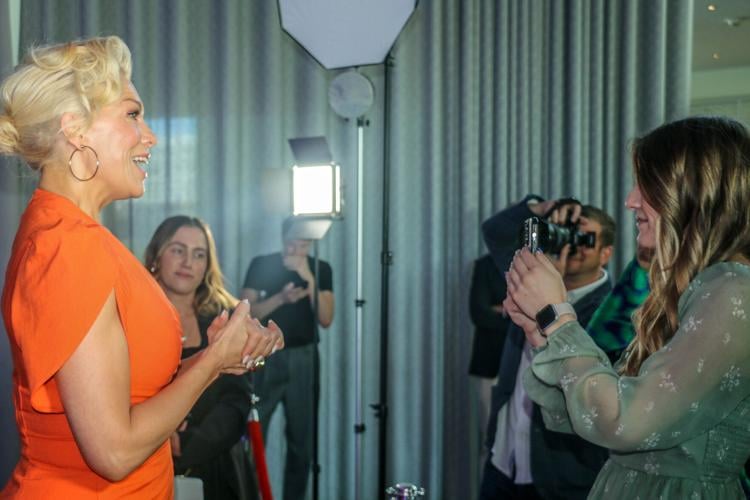 Actor Hannah Waddingham, left, demonstrated her “Ted Lasso” character’s iconic power pose after receiving the Barbara Bridges Inspiration Award at a Women+Film luncheon at the Denver Art Museum on Thursday, May 16, 2024.