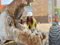 Cleo Parker Robinson poses with the ‘chomper’ piece of excavator used to demolish the annex at her historic dance facility in Denver’s Five Points neighborhood on Thursday, July 25, 2024.