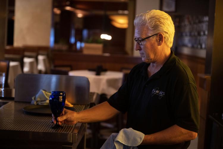 James Gallaher cleans glasses at the bar during a shift at Elways in Cherry Creek on Thursday, Aug. 8, 2024. Gallaher has been working at Always since it opened almost exactly 20 years ago. “I’ve been here since day 1” he said. The Cherry Creek location is closing at the end of the month. (Stephen Swofford, Denver Gazette)