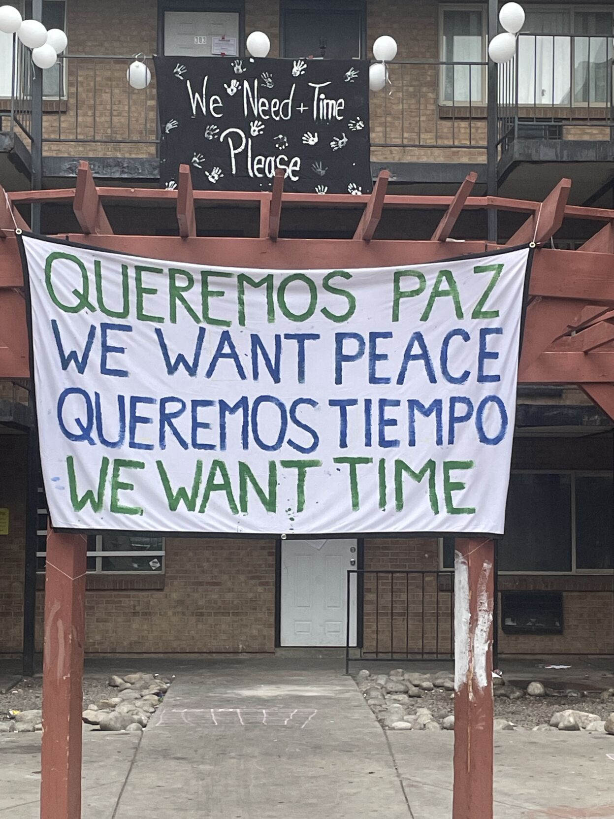 On Friday, a white flag was flying in the parking lot, white balloons and pillow cases hung from the walkways and signs begged for peace — leftovers from a rally held on Thursday by residents begging for extra time.