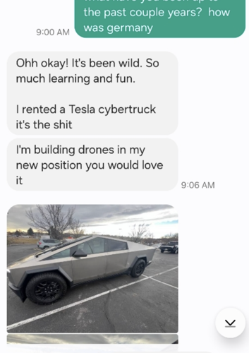 “I rented a Tesla Cybertruck. It’s the s***,” he wrote her at 9 a.m. on Sunday from Denver. He continued to text her until New Year’s Eve, sending photos and music videos of the vehicle.