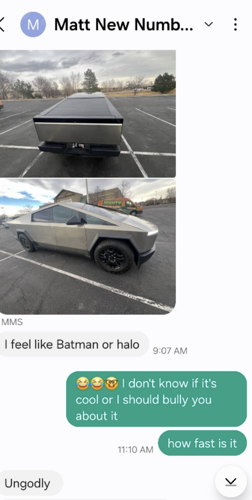 “How fast is it?” Arritt asked of the Cybertruck. He texted back: “Ungodly.”