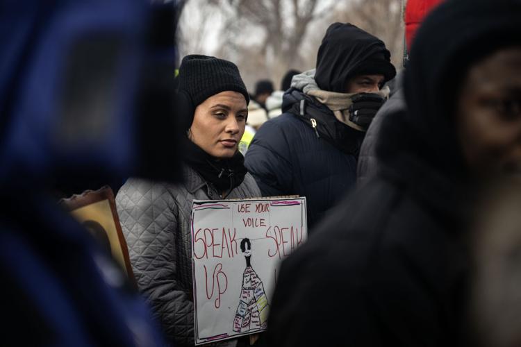 Namugga Nakayiza, a student at the University of Denver, held a sign quoting MLK: “Those who love peace must learn to organize as effectively as those who love war” during the MLK Jr. Day Marade at City Park on Monday, Jan. 20, 2025, in Denver, Colorado.