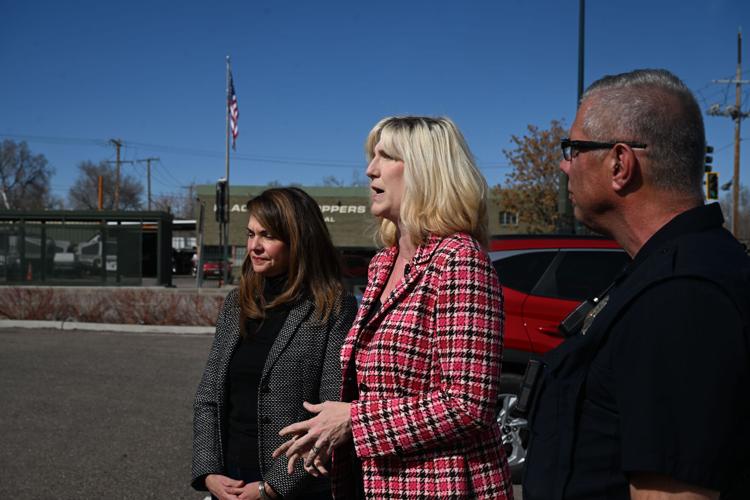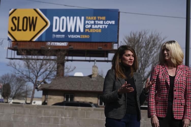 Denver City Councilmember Amanda Sandoval (left) and Department of Transportation and Infrastructure Executive Director Amy Ford (right) announce the city's new marketing campaign against speeding to reduce roadway fatalities on Monday, March 10, 2025. (Stephen Swofford, Denver Gazette)