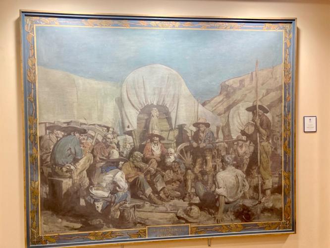 Titled “Commerce of the Prairies,” the 7-feet by 10-feet oil on canvas mural painted by True in 1913 depicts cowboys around a covered wagon, a fiddler playing in the center of the group.
