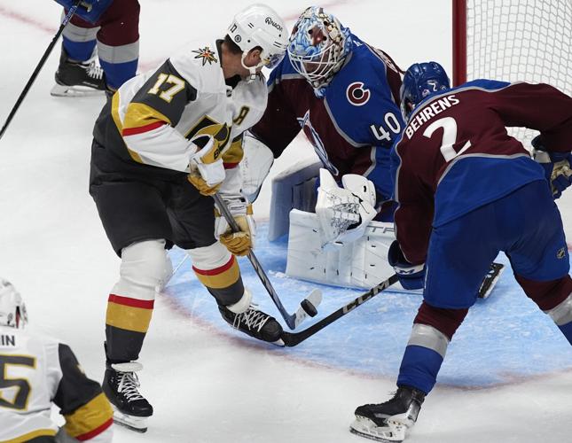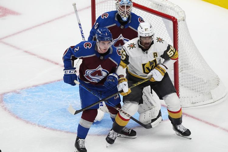 Vegas Golden Knights right wing Keegan Kolesar, right, jostles for position in front of the net with Colorado Avalanche defenseman Sean Behrens as goaltender Alexandar Georgiev, back, looks for the puck in the third period of an NHL preseason hockey game Tuesday, Oct. 1, 2024, in Denver. (AP Photo/David Zalubowski)