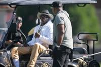 Colorado head coach Deion Sanders talks with former NFL quarterback and former Tampa Bay Buccaneers offensive coordinator Byron Leftwich while watching practice from his golf cart on Aug. 8, 2023, in Boulder.