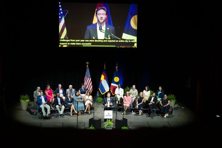 For his second address, Johnston spoke from a platform inside the Seawell Ballroom at the Denver Center for the Performing Arts on July 21 and highlighted a checklist of successes tied to his initial vision for the city.