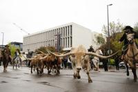 Ranchers from Silverado Ranch march longhorn cattle through the streets of Cherry Creek, Colo. to Bromwell Elementary school to commemorate the opening of Mendocino Farms, a restaurant chain opening their first Colorado location, on Wednesday, May 7, 2025.