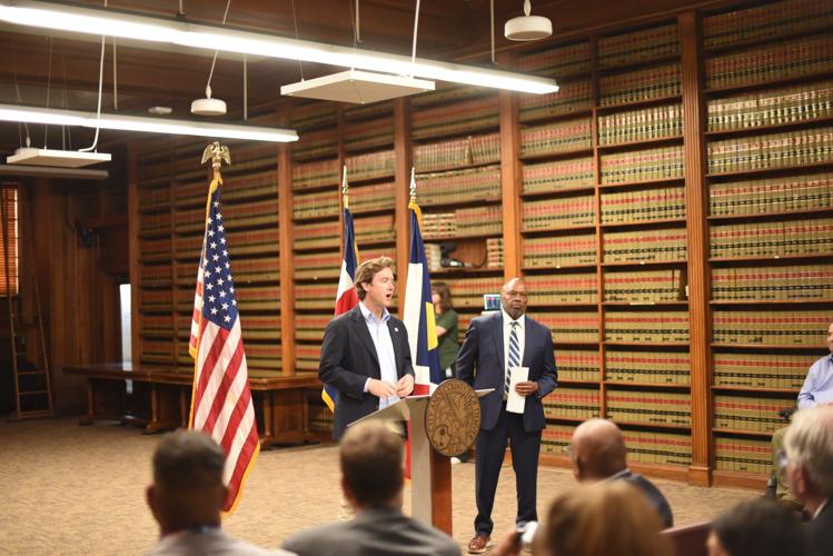 Denver Mayor Mike Johnston speaks in the Parr-Widener Community Room in the Denver City and County Building during the news conference about Denver International Airport soliciting a feasibility study for the implementation of a modular nuclear reactor at the airport on Wednesday, Aug 6, 2025. (Michael Braithwaite / The Denver Gazette)