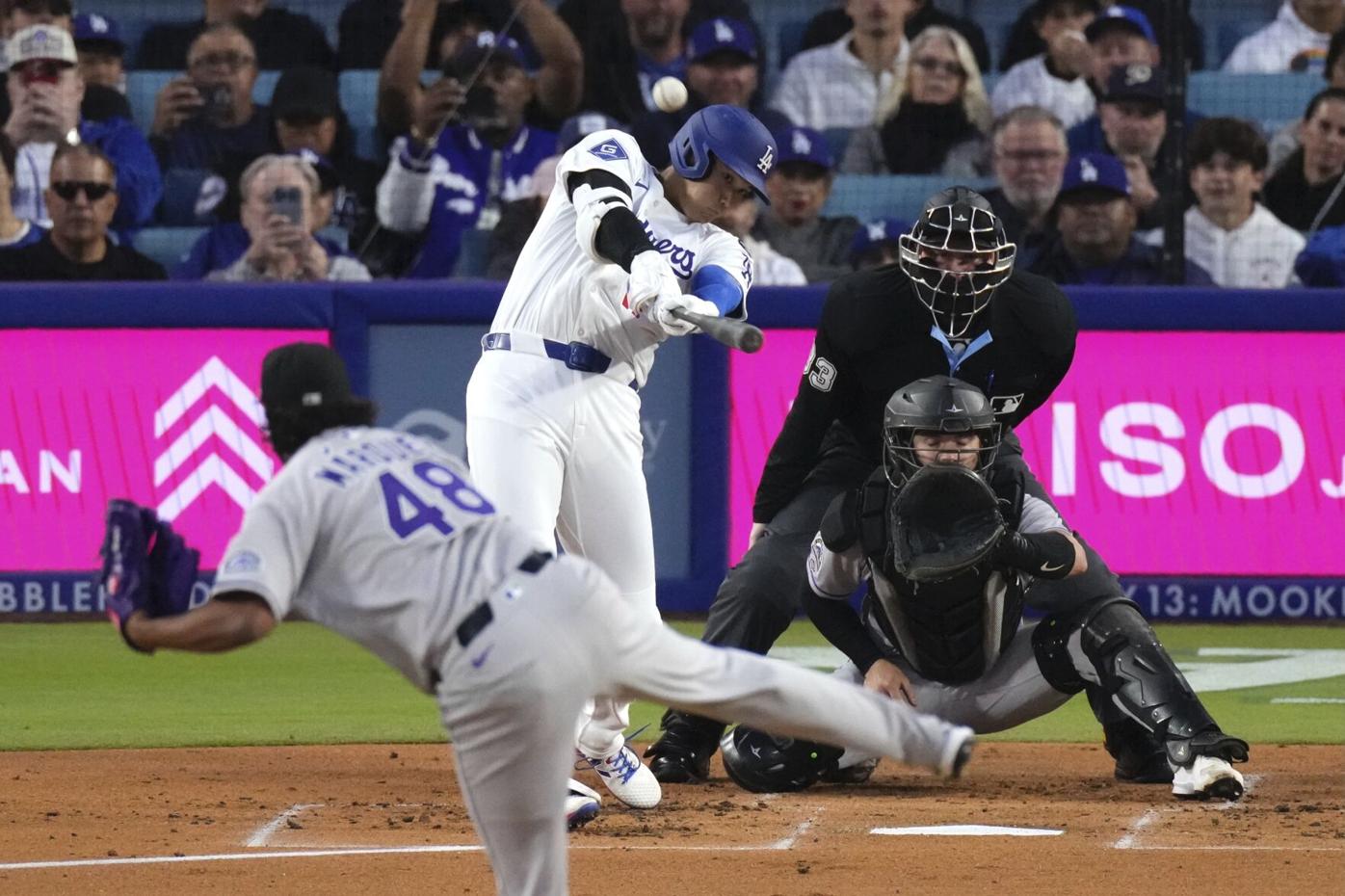 Los Angeles Dodgers' Shohei Ohtani hits a solo home run as Colorado Rockies starting pitcher German Marquez, left, watches along with catcher Braxton Fulford during the first inning of a baseball game against the Colorado Rockies Wednesday, April 16, 2025, in Los Angeles. (AP Photo/Mark J. Terrill)