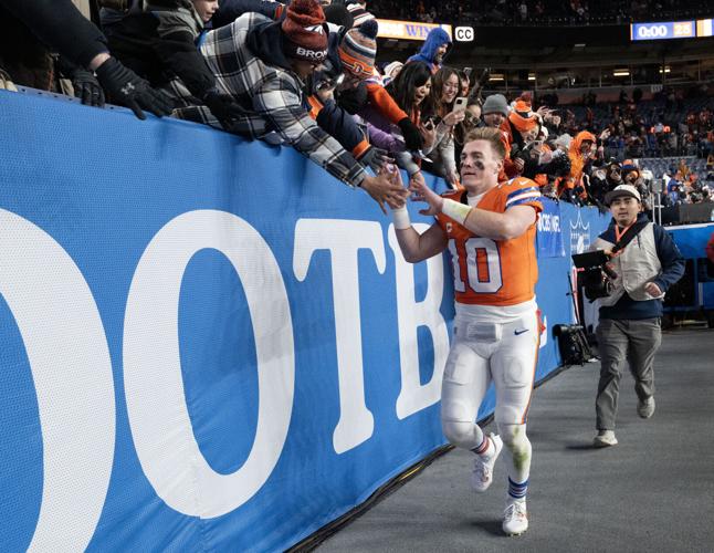 Denver Broncos quarterback Bo Nix (10) celebrates with fans after the win over the Kansas City Chiefs Sunday, Jan. 5, 2025, at Empower Field at Mile High in Denver.The Broncos won 38-0 to reach the playoffs for the first time since they won Super Bowl 50. (The Gazette, Christian Murdock)