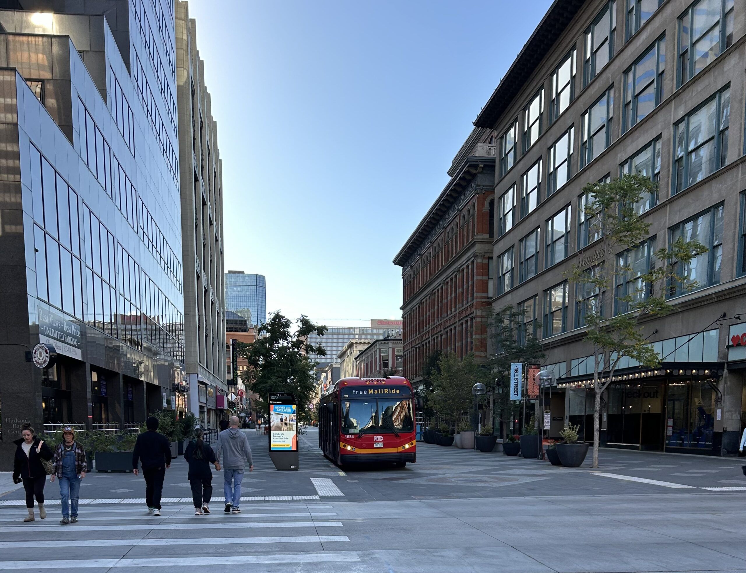 The free MallRide shuttle operates from 5:21 a.m. on weekdays until its final loop from Union Station at 1:19 a.m. The 1.2-mile route between Union Station and Civic Center Station stops at every intersection, providing a roughly 15-minute end-to-end trip. As part of the RTD network, buses arrive every few minutes during peak periods and connect major bus and rail lines at both ends.