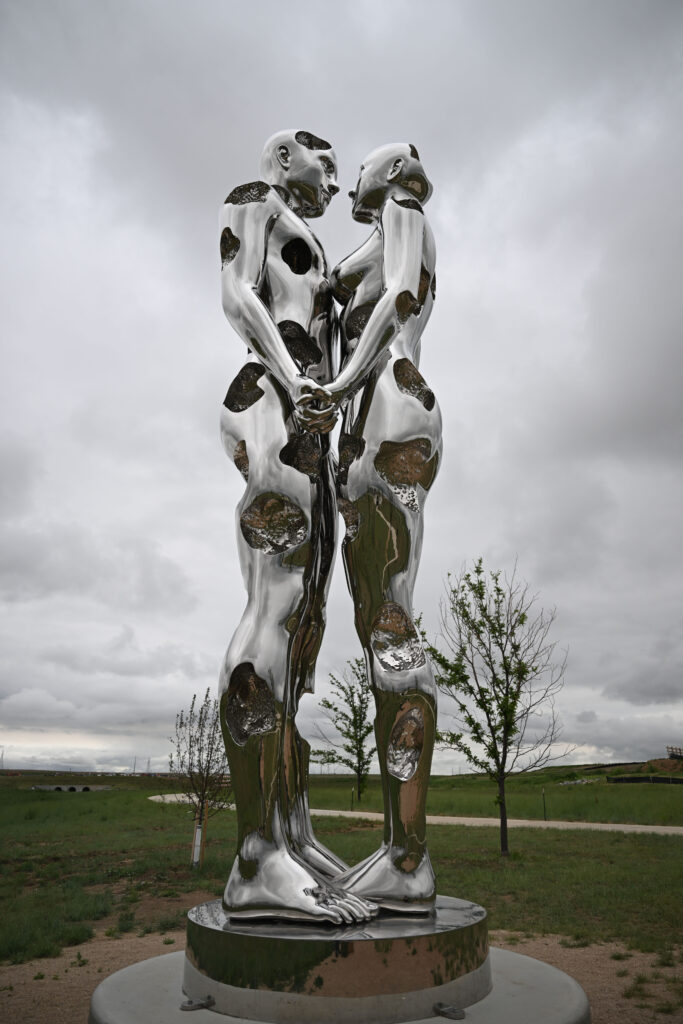 Just off the paved trail winding through the park stands a polished steel sculpture of a couple at eye-popping scale — their 25-foot silhouettes pierced with multiple holes but their connection immovable.