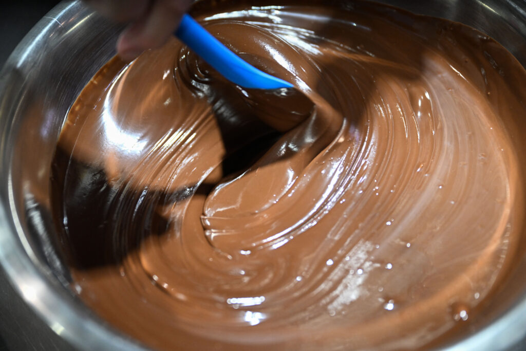 Chocolatiers from Bibamba Chocolate, a Denver-based chocolate shop using cacao beans from the owners’ family farm in Cameroon, pour chocolate into molds at their store in the Edgewater Public Market on Tuesday, Feb. 25, 2025. (Stephen Swofford, Denver Gazette)