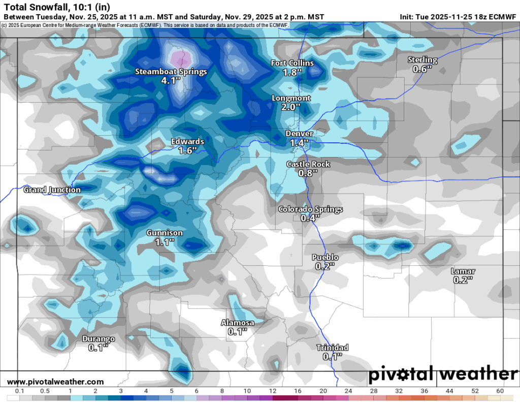 Overnight Wednesday into Wednesday morning, another system is forecast to approach Colorado from the northwest and bring more snow through Thursday, Dec. 4.