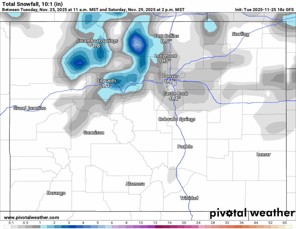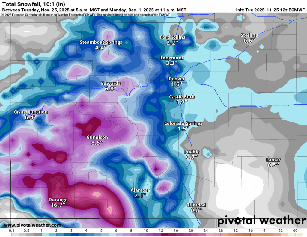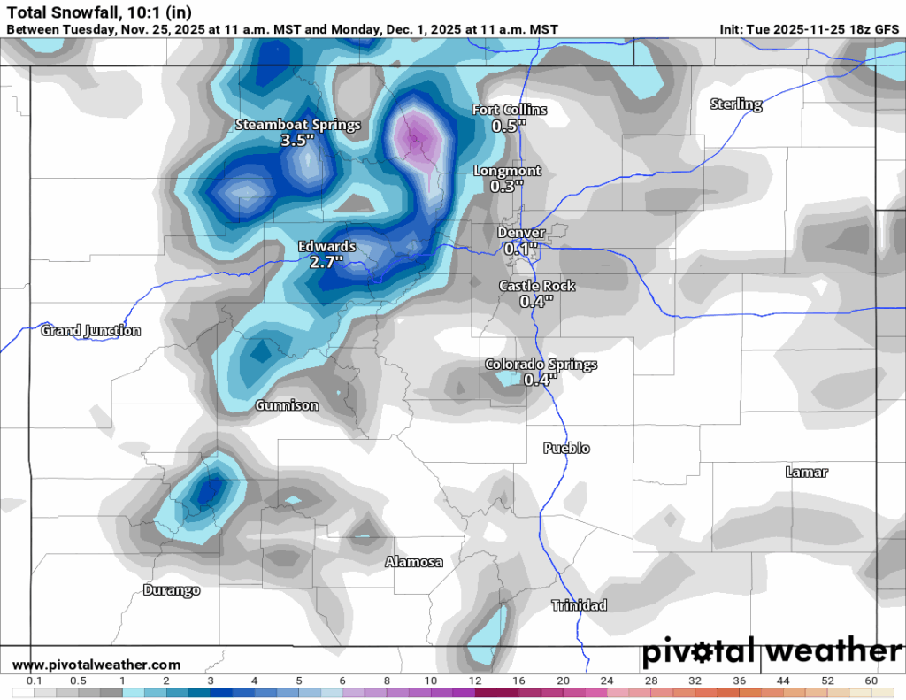But the southern mountains do see the potential for a lot of snow heading into the first week of December as winter storms line up over the first several days to hopefully drop much needed snow on the Centennial state.