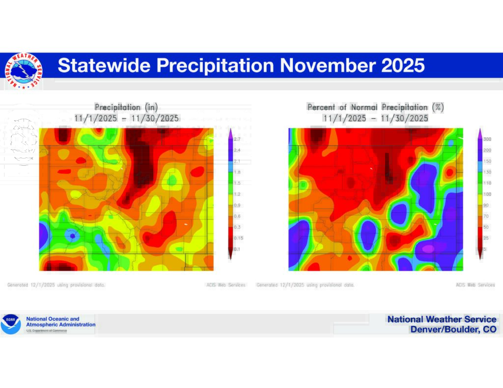 Further east, 15.46″ of precipitation has been recorded at DIA from Jan. 1 to Nov. 30 in 2025, however, DIA’s rainfall of only 0.09″ inches in November was 0.55″ inches below normal.