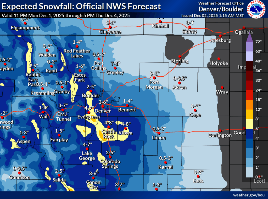 The first snow of December is forecast to start falling late Tuesday night into Wednesday morning as the next round of winter weather approaches the Mile High City and the city’s first winter weather advisory of the season goes into effect.