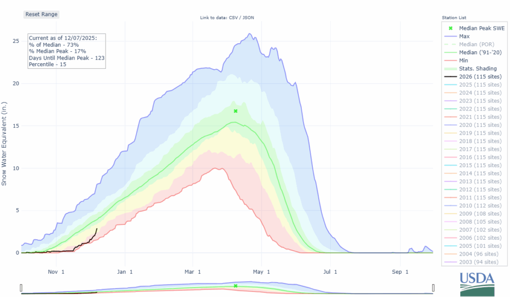 After a snowy first week of December, that average ascended 36 percentage points to 73% of median average, with 2.9 inches of snow water equivalent locked away in the snowpack.