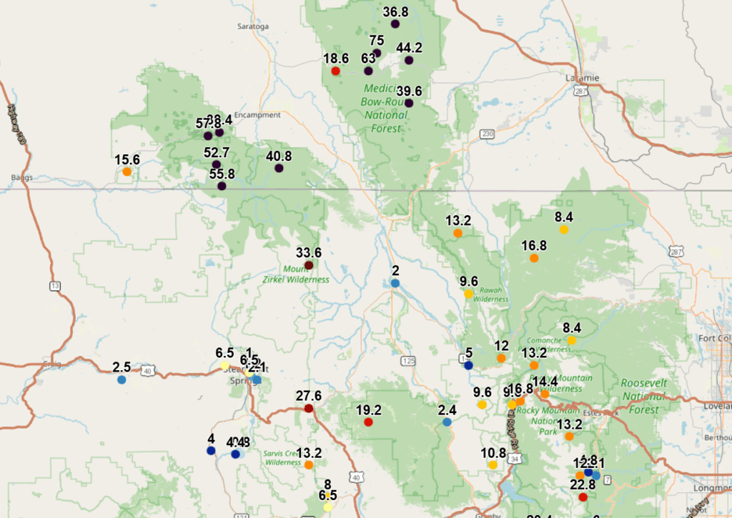Further north, in the Medicine Bow Range of Wyoming, the SNOTEL site at Medicine Bow Peak west of Centennial, WY recorded a whopping 75 inches of snow in 48 hours.